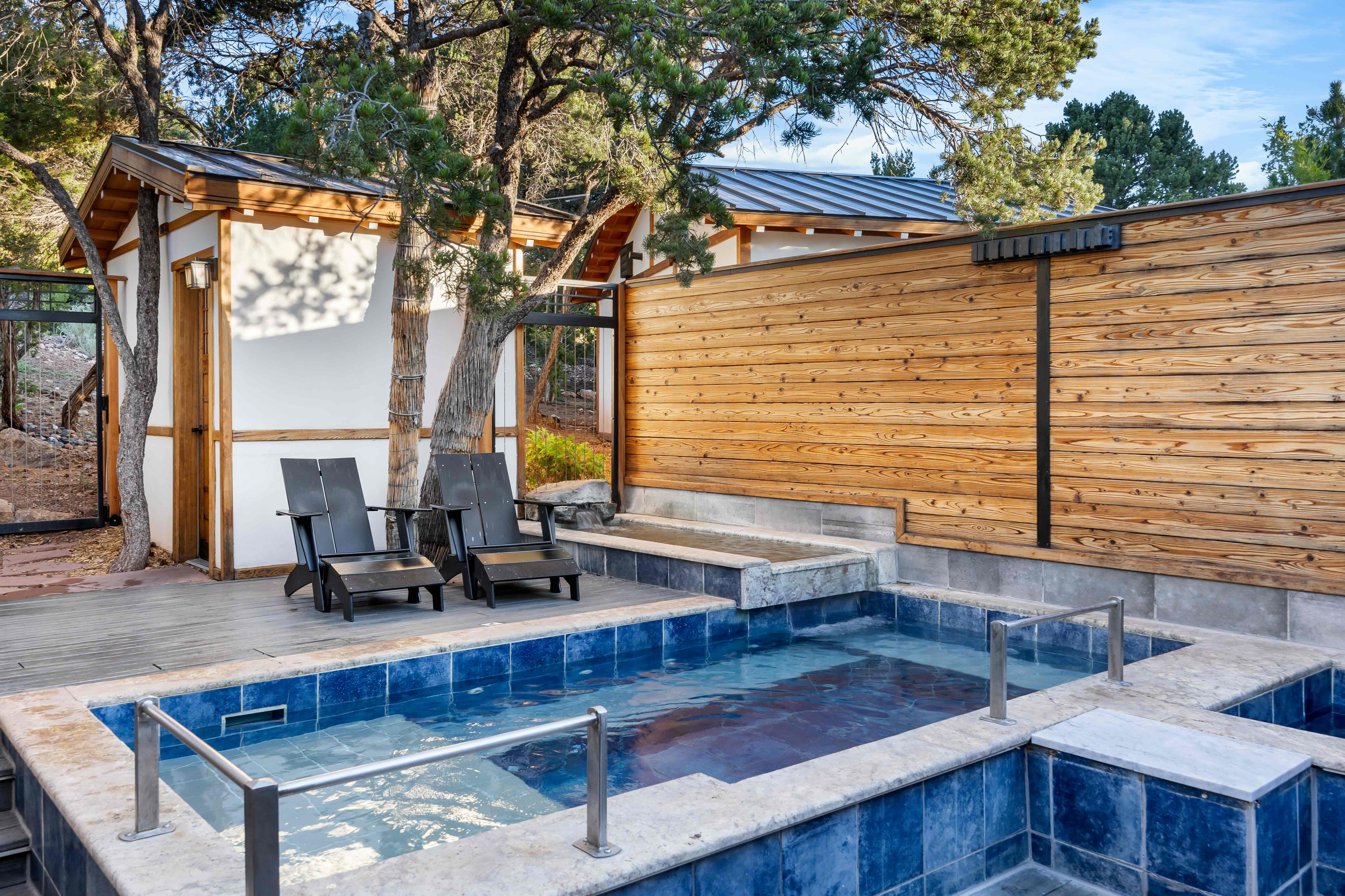 New Wave is the only tub with an underwater recliner built for two, as well as benches at different depths, a formidable cold plunge, and a decktop flume. It may have the best sauna on the property. Big decks for sun, shade, and starlight.
